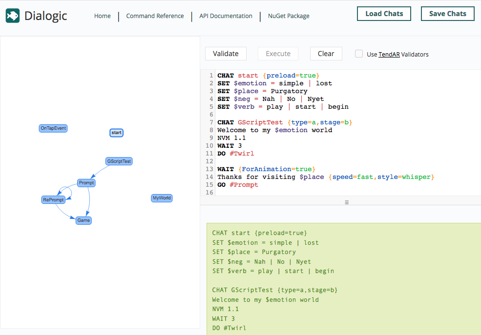Dialogic (Daniel Howe) is a system designed to help writers easily create interactive scripts with generative elements. It enables writers to craft compelling dialog that responds organically both to user prompts and to events in the environment. The system supports arbitrarily complex interactions between multiple actors, but makes no assumptions about how text is displayed, or about how users will choose their responses. Dialogic was awarded 'Exceptional Paper' and nominated for 'Best Paper' at The International Conference on the Foundations of Digital Games (FDG2020).